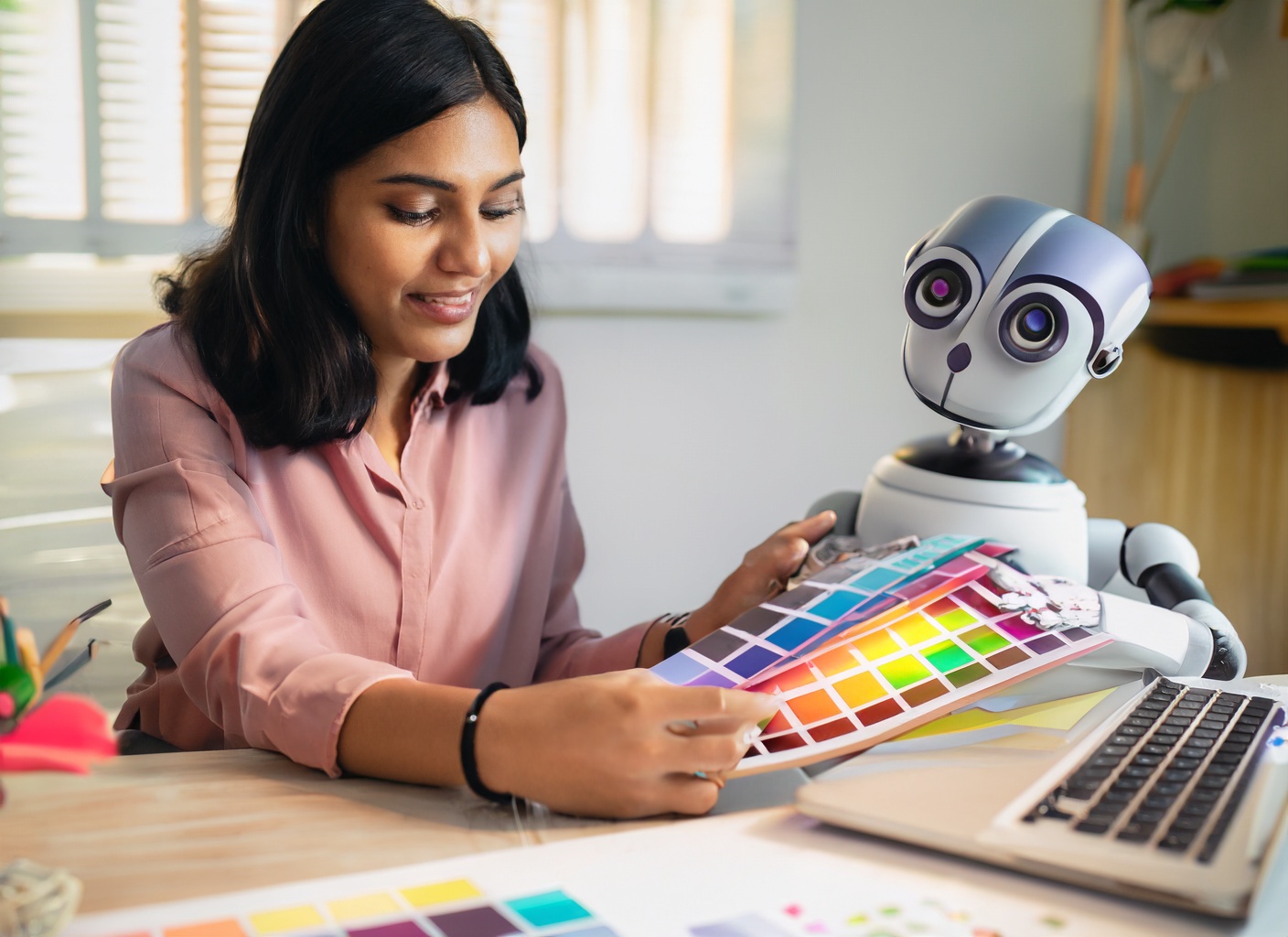 Image created by Adobe Firefly with the prompt: Graphic designer working with a robot friend to pick colors from a swatch book.